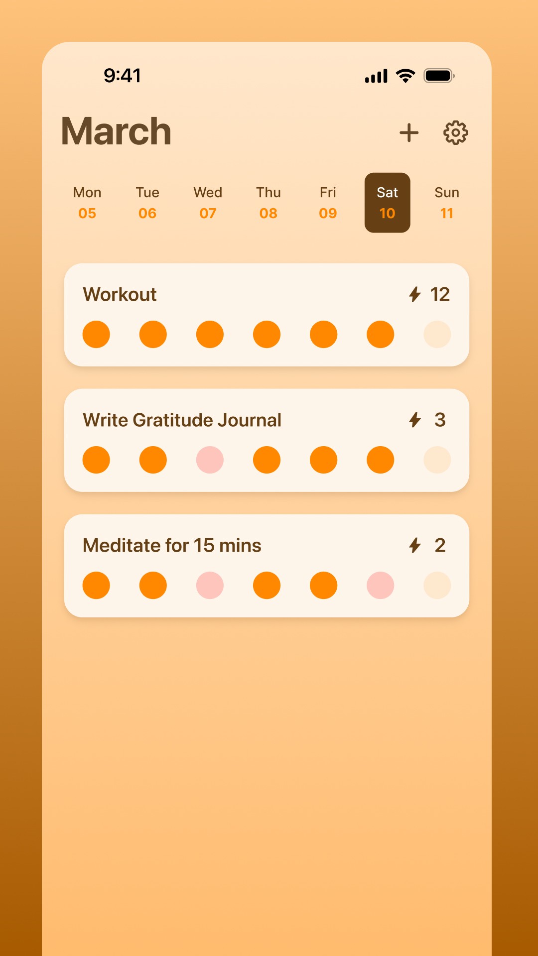 A single-screen view of today's habits, large clear checkboxes, and immediate visual confirmation. That's it. Every additional element is a reason to close the app before completing the log.